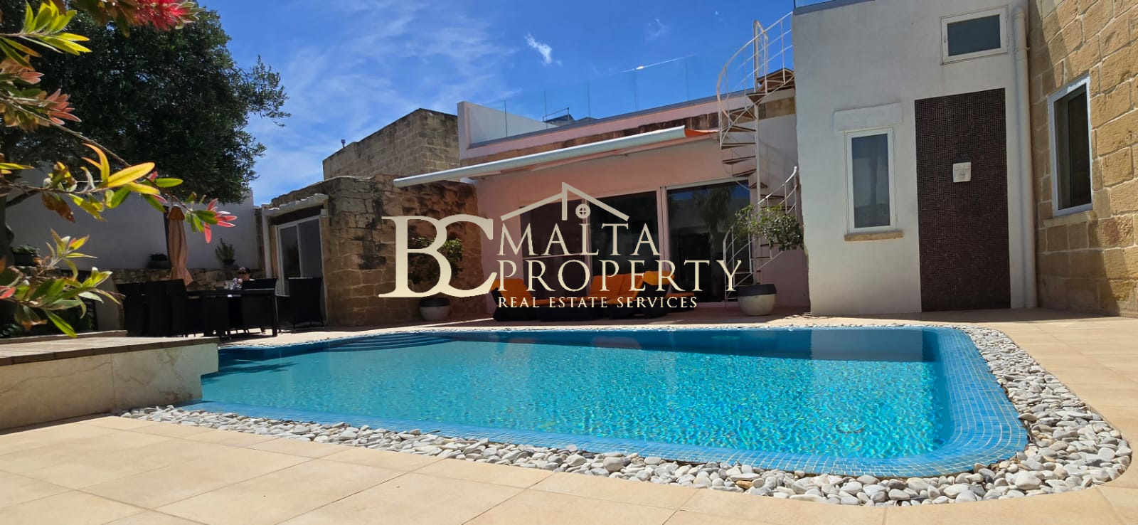 Outskirts of Żurrieq, this beautiful farmhouse consists of an entrance hall, lounge area with tv, sutdy/working area leading to a bright and sunny living/dinning room which leads to an overall sunny good size pool with a jacuzzi and a bbq area. On the same ground level you will find a separate fully equipped Kitchen including dishwasher, a bathroom, two bedrooms and a laundry room with a tumble dryer. On the upper level you will find a double bedroom with ensuite and a big sunny terrace overlooking the pool area.